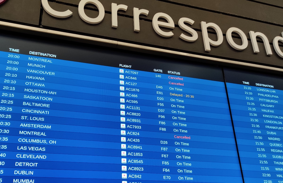 Eenmaal aangekomen op Toronto kwamen de automatische sms’jes van de vliegmaatschappij al binnen. Aankomende vlucht was vertraagd, exacte informatie konden we wel bij een balie achterhalen. De borden gaven in eerste instantie nog vertraging aan, maar dat liep al snel op. En daar kwam het verlossende bericht: vlucht geannuleerd.