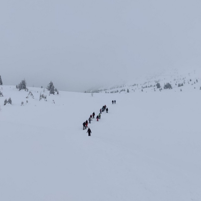 Vroeg in de ochtend werden we al opgehaald om naar de pistes te gaan. We moesten namelijk met de lift omhoog, want daar zo ons wandelavontuur beginnen. Eenmaal boven op de berg aangekomen kregen we wat uitleg over de schoenen, hoe je moest lopen en wat je moest doen als je om was gevallen.