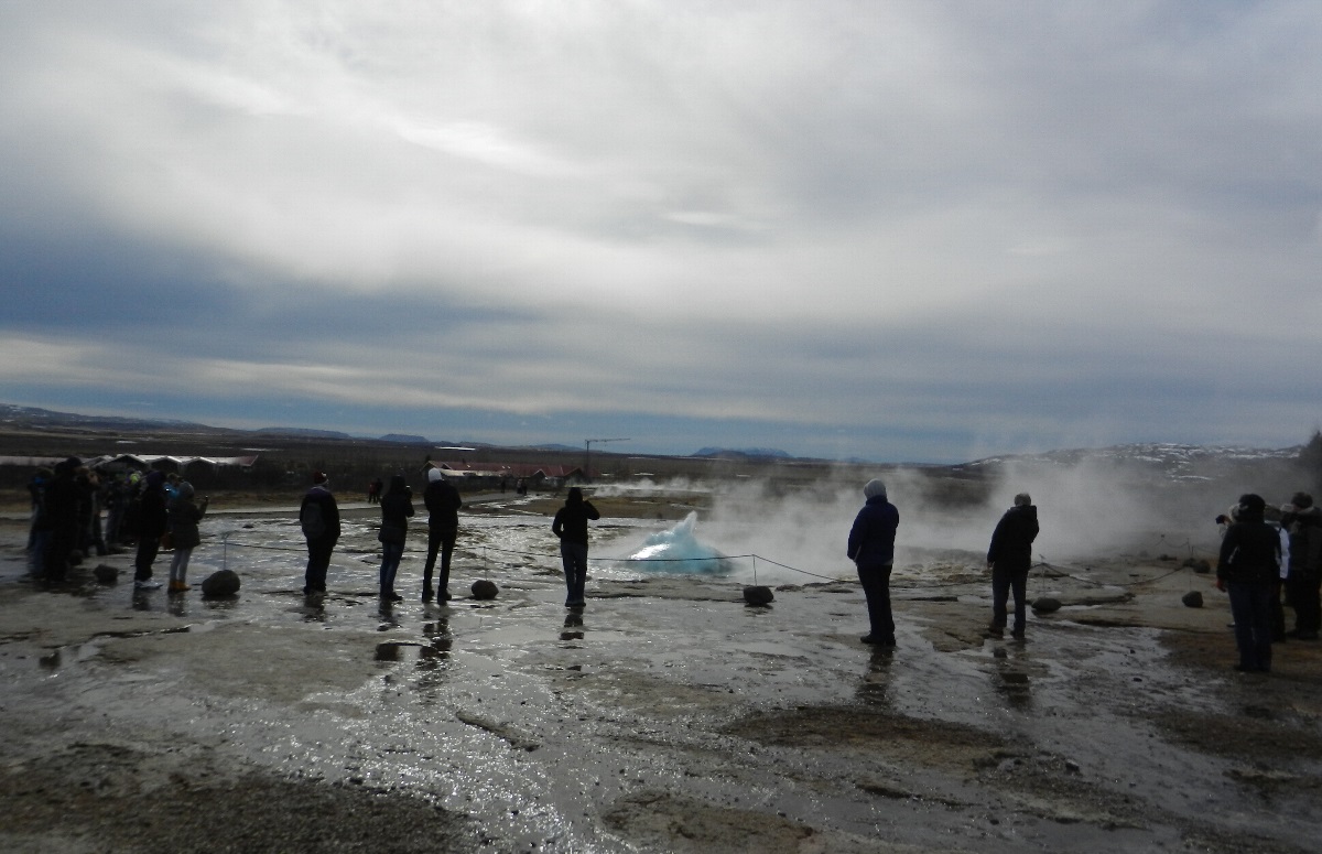De grootste en hoogste geiser is natuurlijk het mooiste, dus daar hebben we ook een tijdje bij staan kijken. Heerlijk met een paar anderen kijken naar het kolkende water, want activiteit is er altijd wel te vinden bij zo’n geiser. Honderden liters waters die heen en weer bewegen en kleine golfjes creëren. Ze worden wat groter en zakken weer weg… Als er een kopje komt is het camera’s in de aanslag, daar komt die, daar komt die… O nee toch niet.