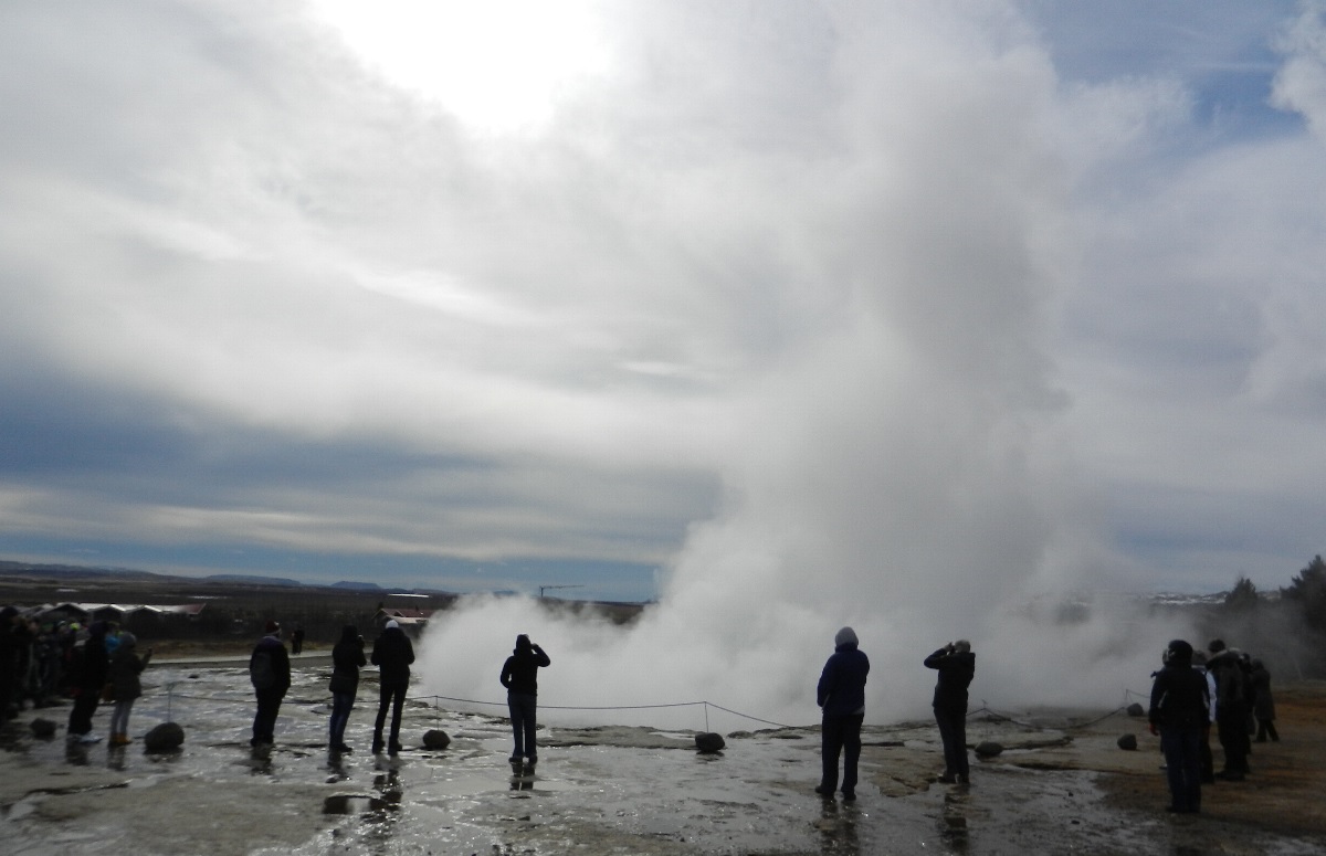 Camera’s nog even weg dus, maar daar begint hetzelfde riedeltje weer vanaf het begin. Golfjes, wat grotere golfjes, een kopje, groter en groter en flotssss. duizenden liters water schieten de lucht in, misschien wel een meter of twintig hoog. Eruptie klaar, dan klettert al dat water ook weer meters naar beneden wat ook weer zorgt voor een groot spektakel. Al met al is het elke keer dat een geiser ‘ontploft’ een avontuur, een wonderschoon natuurlijk avontuur. Wereld, wat ben je soms toch mooi om van te genieten!