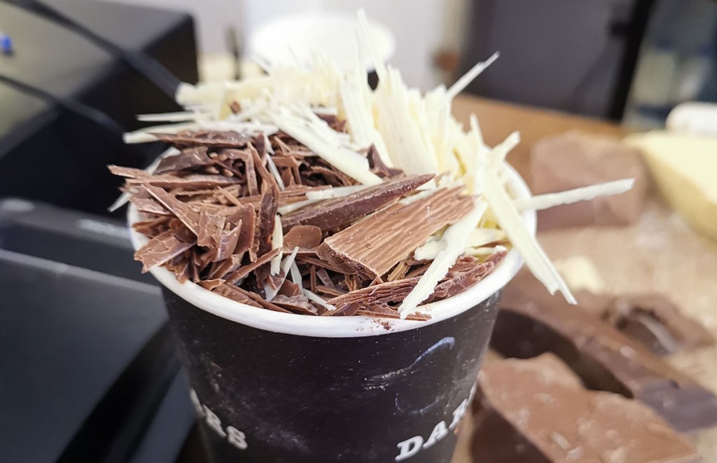 Neem vooral een zakje truffels mee, maar kies om even lekker op te warmen (of omdat je simpelweg een zoetekauw bent zoals ik) niet voor eetbare chocolade, maar voor de drinkbare variant. De presentatie van de warme chocolademelk van Dark Sugars is namelijk fenomenaal. Allerlei chocoladestokken en schilfers worden in een bekertje gezet en daar wordt warme melk bijgeschonken.