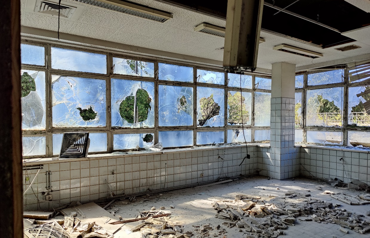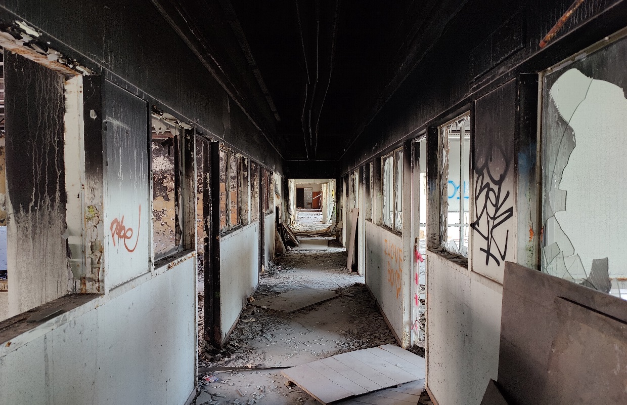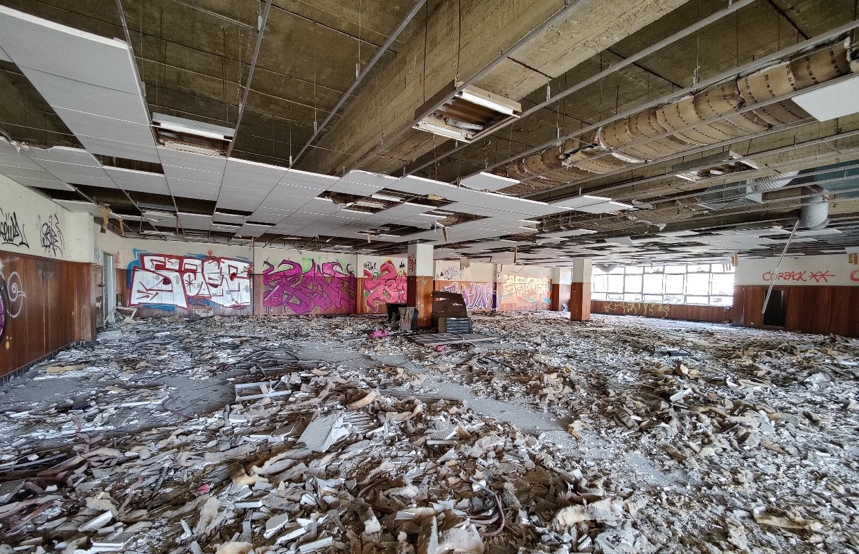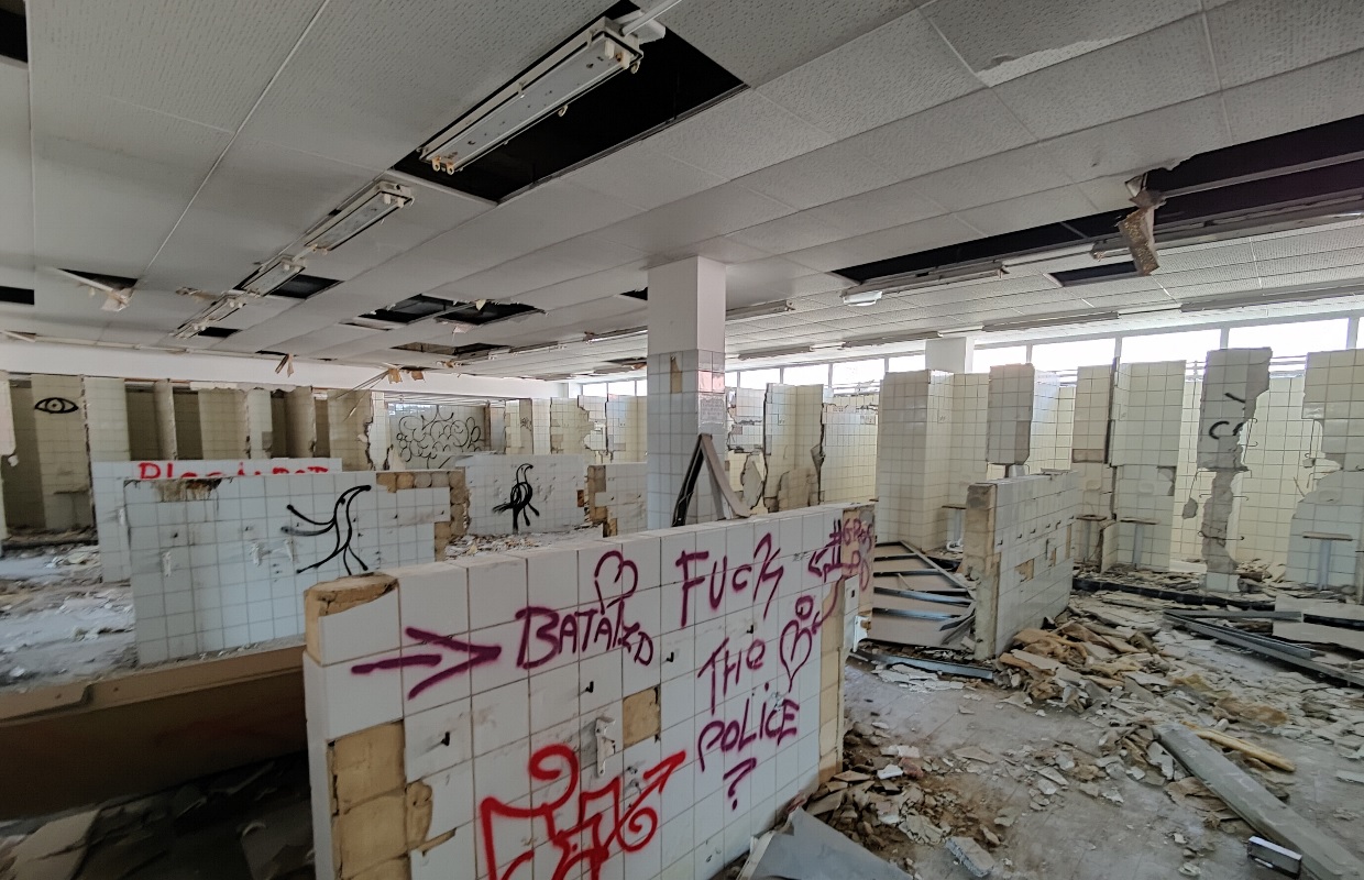 Aan de andere kant van het water stond de daadwerkelijke centrale, dus ook daar zijn we naartoe gegaan. Kwestie van een hekje door en dat was ’t al. Ernaast stond een oud gebouw, wat we ook hebben ontdekt. Dat was werkelijk waar helemaal kort en klein geslagen. Geen enkele ruit was nog heel, alle plafonds waren gestript, in de toiletruimtes was geen enkel tegeltje meer heel, kasten lagen overhoop en net als buiten zag je overal tags, graffiti en ware kunstpareltjes. Ook had er in sommige ruimtes een flinke brand gewoed, waardoor alles onder de zwarte roet zat.