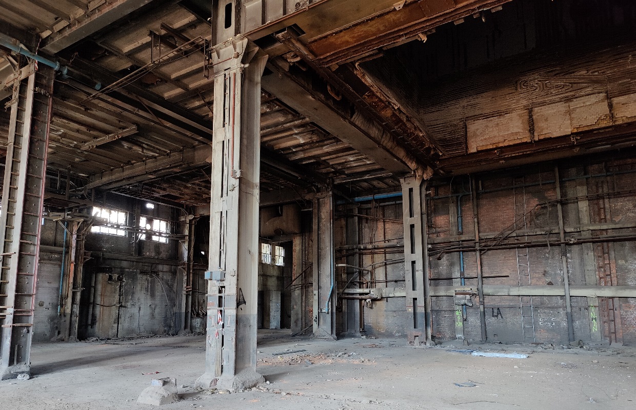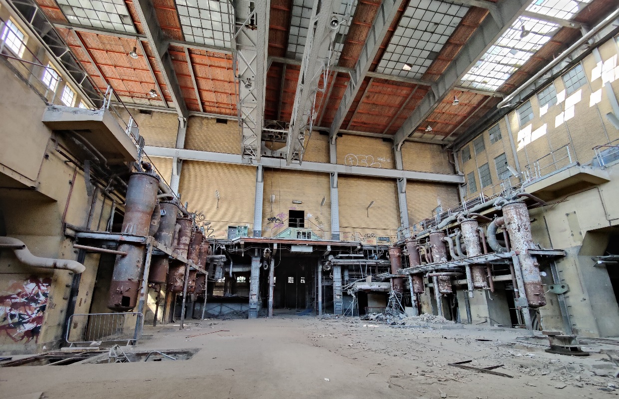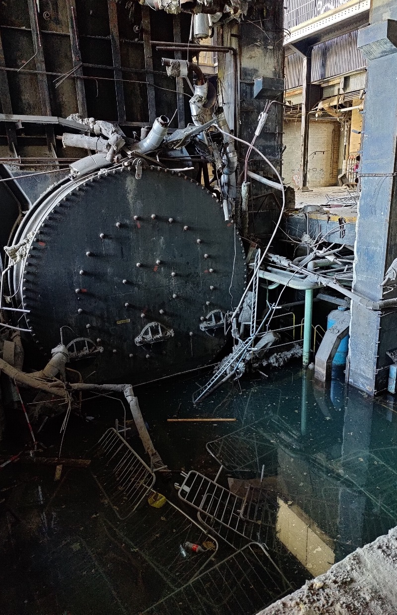 De eerste stappen in een van de hallen waren heel tof, een immense ruimte met grote ketels, kilo’s zand en stof, roestige pijpen, olievlekken en overal gaten in de vloer waar water in stond. Kwestie van oppassen dus, maar ook genieten van de stilte, foto’s maken als een malle en jezelf voorstellen hoe bedrijvig het er jaren geleden was.