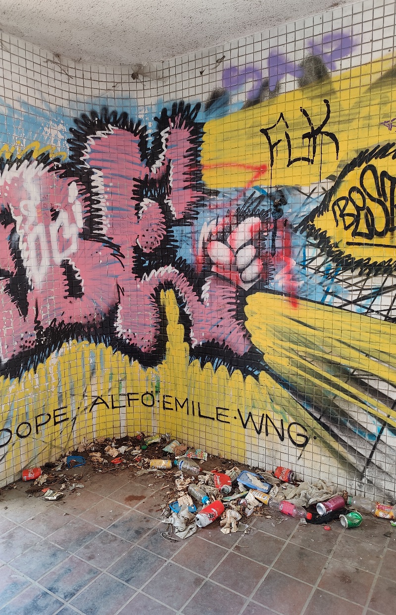 Dat was allemaal een stuk chiller, niet alle trappen waren daar weggehaald dus we konden nog de hoogte in ook, perfect voor wat toffe foto’s. De koeltoren konden we niet in, maar wel een grote opslagloods. Fantastisch om allemaal te zien en te ontdekken. Oude elektriciteitspanelen waren volledig gestript, overal lag afval en waar je ook keek zag je graffiti.