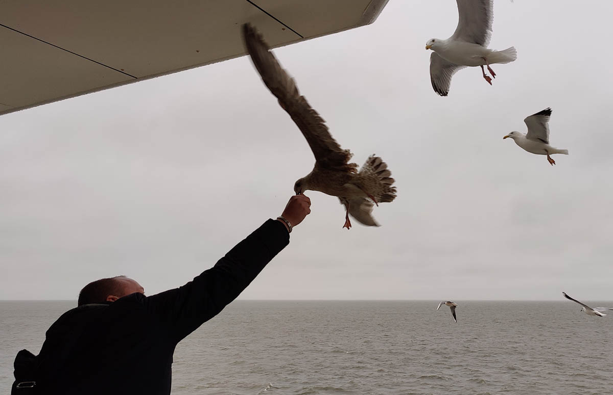 Wat het meeuwen voeren vanaf de boot zo leuk maakt, is dat je op een gegeven moment een heel leger meeuwen naast de boot hebt meevliegen. Ouders met kinderen komen erbij staan, die willen ook meedoen. En dan komt het van pas dat je een heel brood hebt meegenomen, want dan kun je wat kinderen ook een boterham geven voor de vogels.