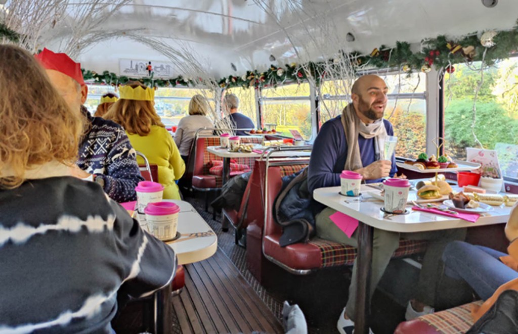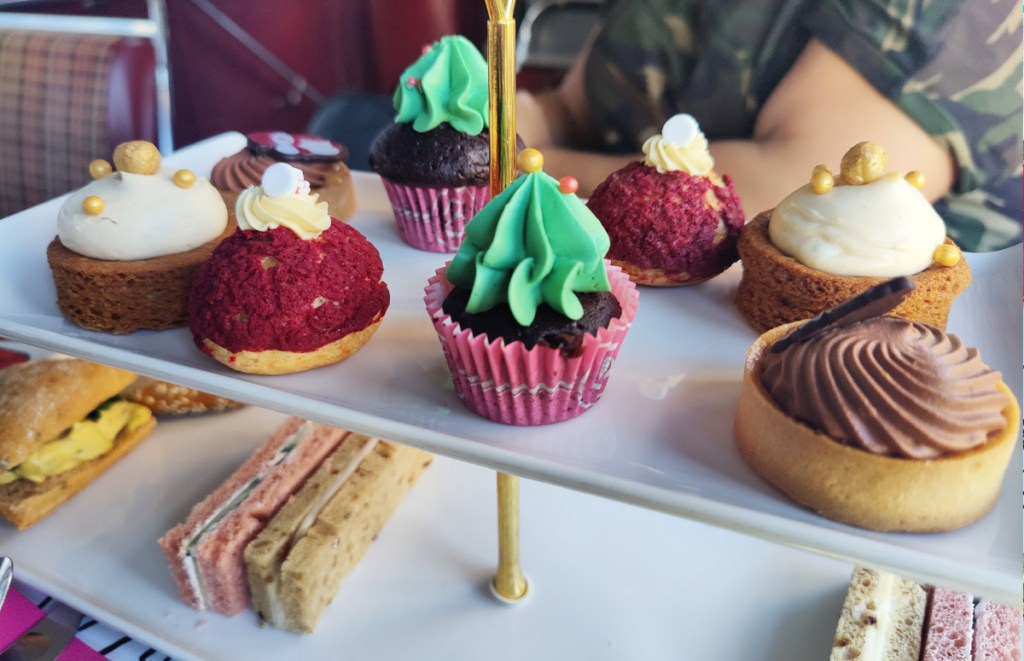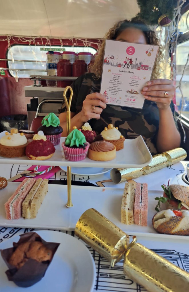 Ik dacht eerst dat de afternoon tea wat duurder uitviel in de bus, door mijn eigen ‘schuld’. Ik heb ervoor gekozen om een zitplek te kiezen, omdat ik per se boven wilde zitten. Kies je hier niet voor, dan scheelt het echter een paar euro, dus dat is het niet. Het is gewoon echt een prijzige afternoon tea. We deden hem wel met kersttijd, dus we konden rekenen op wat kerstige extra’s zoals een christmas cracker en koddige kerstlampjes die de bus nog sfeervoller maakten.